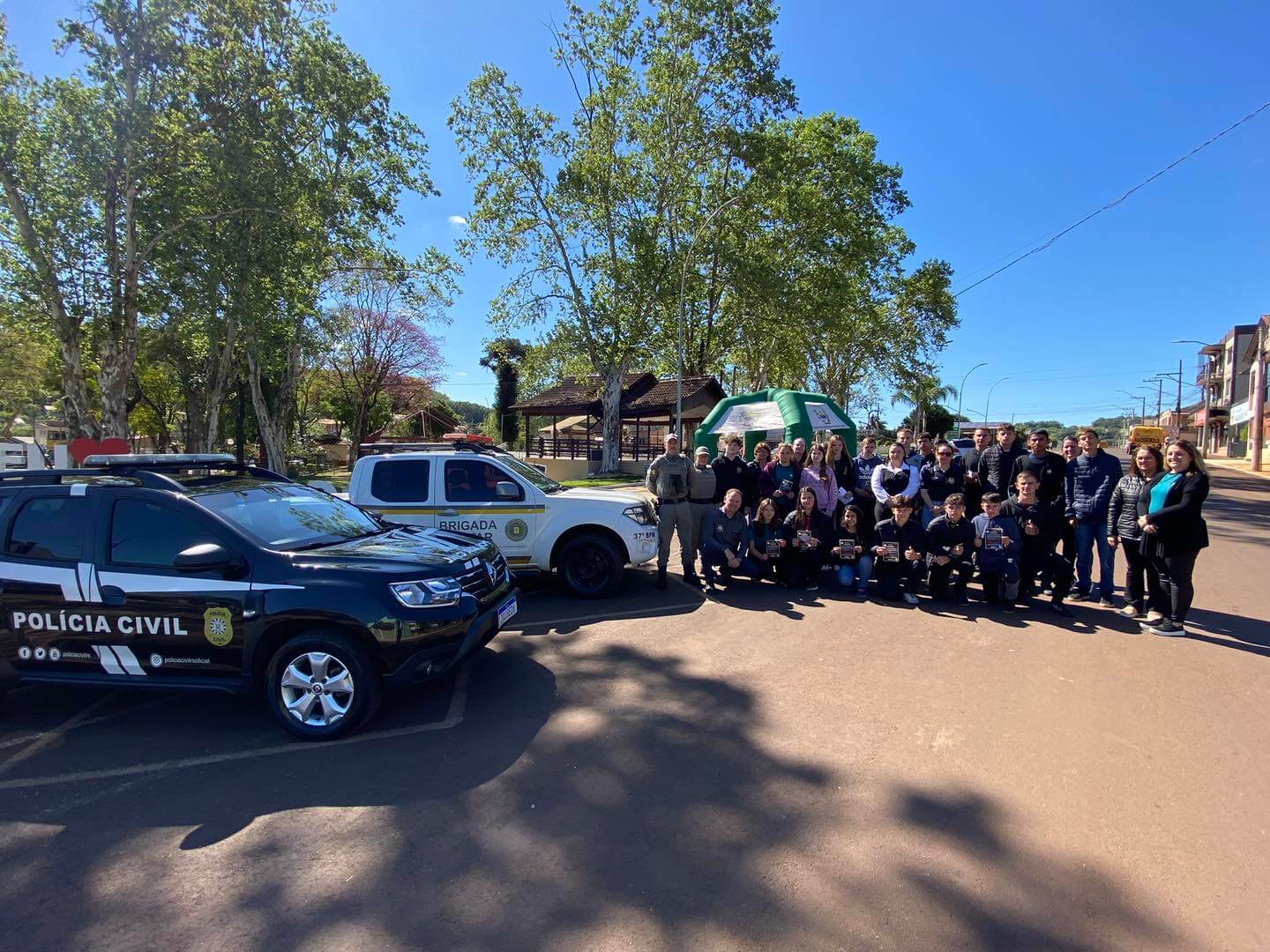 Os estudantes distribuíram folders informativos com orientações sobre a velocidade permitida dentro do perímetro urbano e a importância do respeito às rotatórias em torno da Praça do Imigrante, local de intenso fluxo de veículos e pedestres.