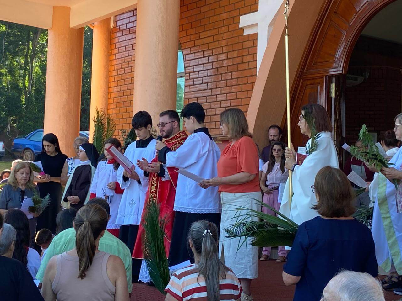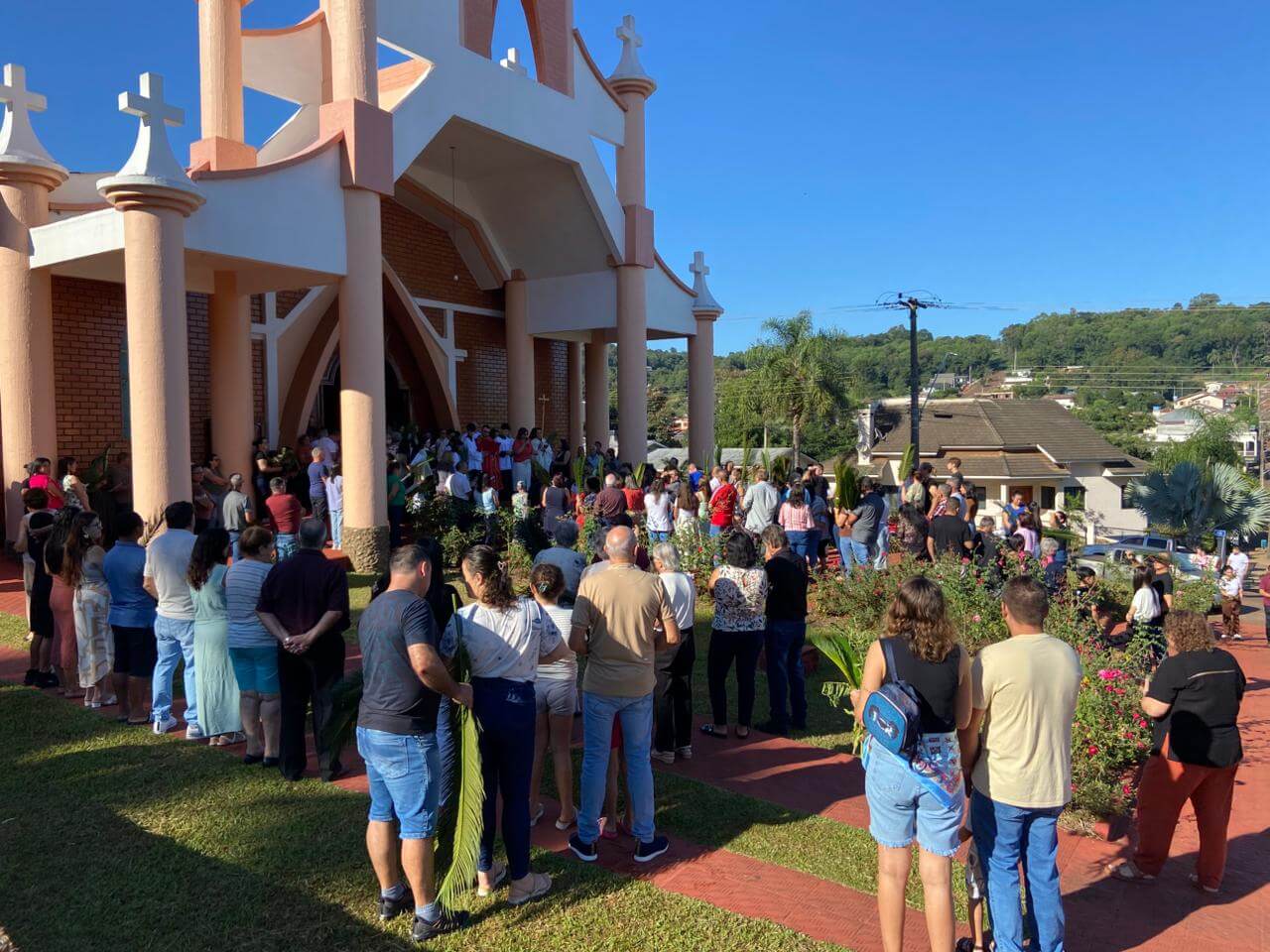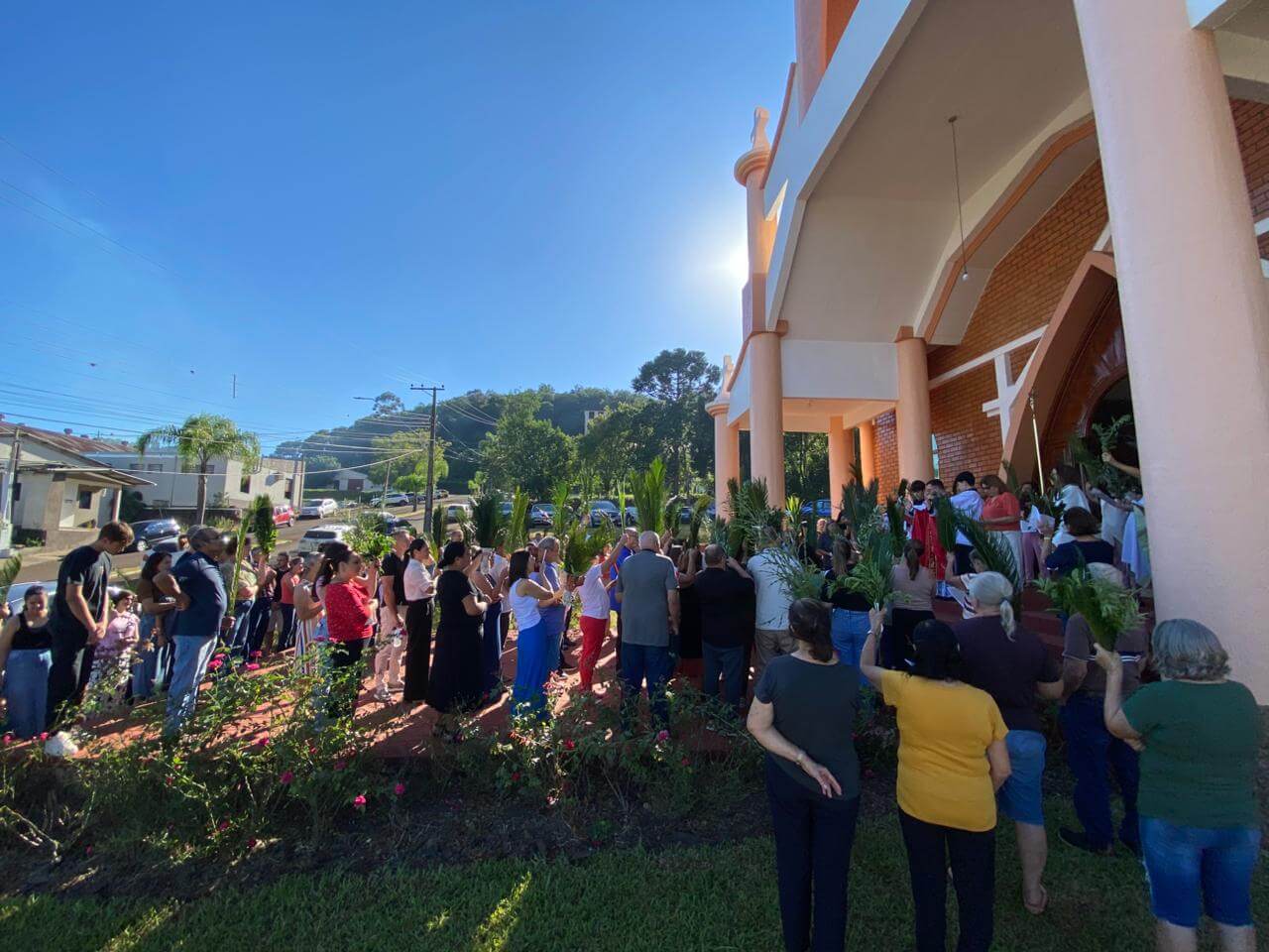 A programação iniciou em frente à igreja, onde os participantes se reuniram levando seus ramos, símbolo da acolhida de Jesus em Jerusalém. Em seguida, foi realizada uma procissão até o interior do templo, relembrando a entrada triunfal de Cristo.