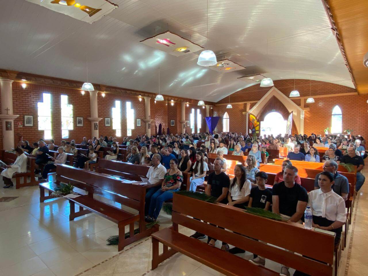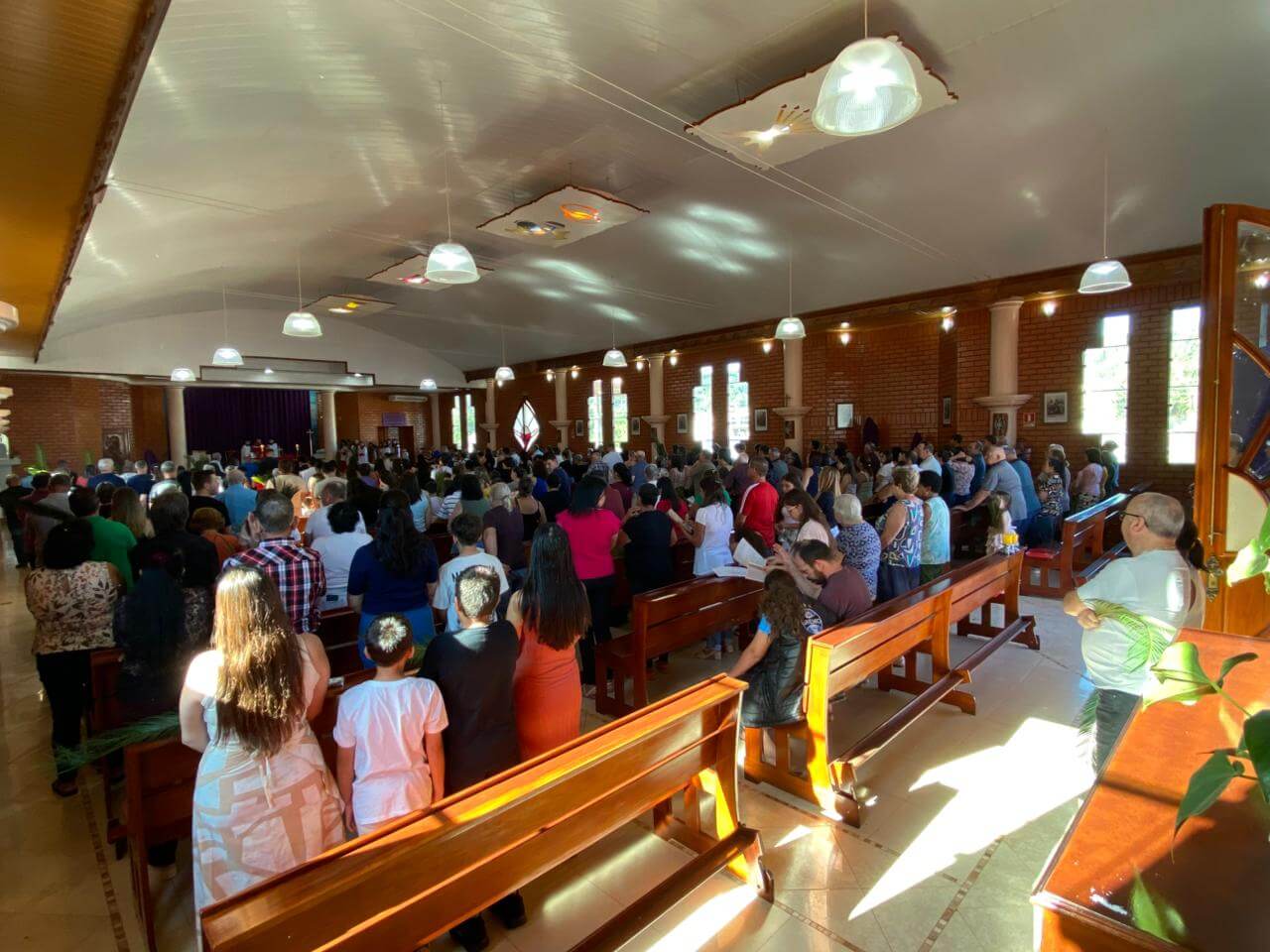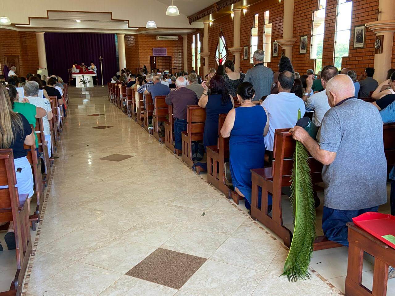 A programação iniciou em frente à igreja, onde os participantes se reuniram levando seus ramos, símbolo da acolhida de Jesus em Jerusalém. Em seguida, foi realizada uma procissão até o interior do templo, relembrando a entrada triunfal de Cristo.